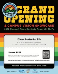 We are excited to invite you to the Ribbon Cutting Ceremony at our new campus for our Substance Abuse Comprehensive Treatment (SACOT) Program at 2500 Pleasant Ridge Rd, State Road, NC, on Friday, September 5th, 2025, from 12:00 PM to 2:00 PM. The event will begin with a special Ribbon Cutting Ceremony, featuring guest speakers, refreshments, and snacks. Afterward, we will offer tours of our new facility and hold a groundbreaking ceremony to showcase our exciting vision for the future development of the entire campus.